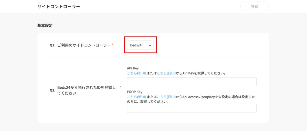 ![1.管理画面[外部接続設定]→サイコン設定]より、「Q1.ご利用のサイトコントローラー」で「Beds24」を選択します。の画面