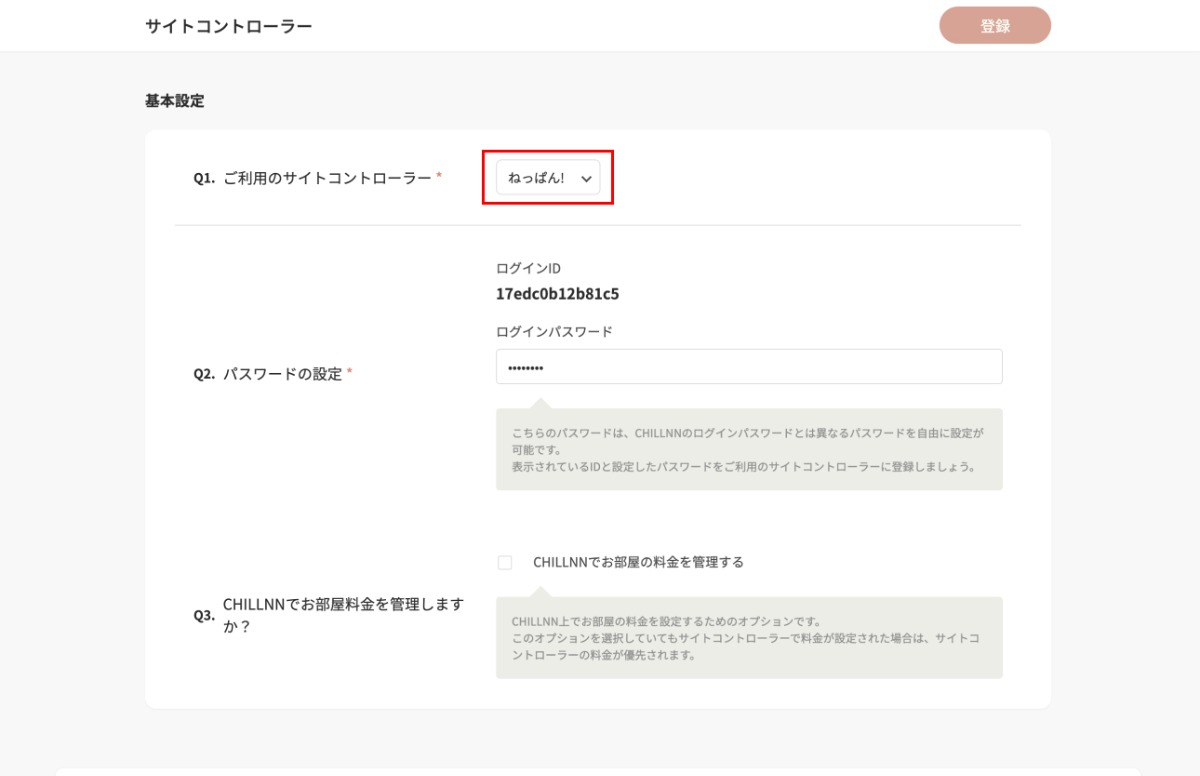 - 「Q3.CHILLNNでお部屋料金を管理しますか?」では、サイトコントローラーとは紐づかない独自の料金管理をされたい場合はこちらにチェックを入れてください。