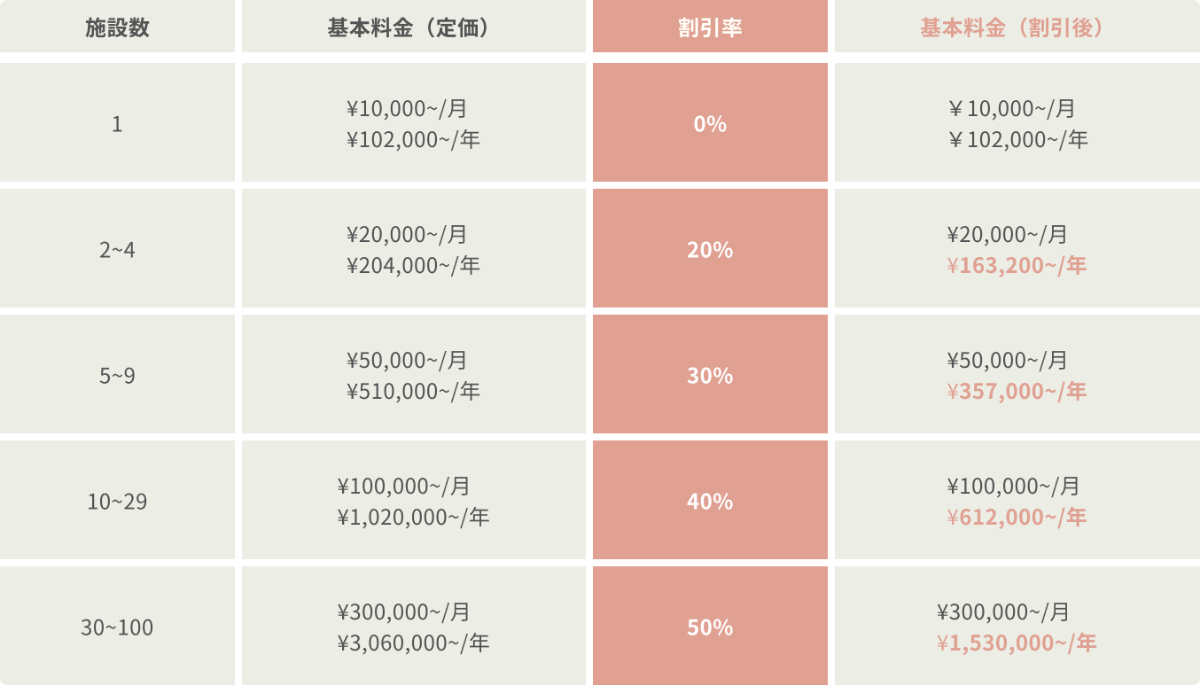 このような現状から、より複数施設を運営する事業者様の課題に寄り添うため、この度「複数施設割引キャンペーン」を開始しました。