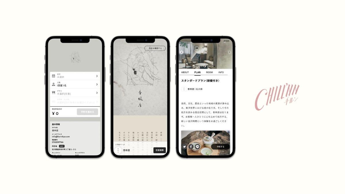 株式会社CHILLNNはHOTEL SHE,や香林居などのホテル運営会社発スタートアップです。2021年1月末に自社施設での運営ノウハウを活かした直接予約エンジン「CHILLNN」をローンチし、こだわりを持った良質なホテルや旅館を中心に既に600施設以上にご導入いただいております。