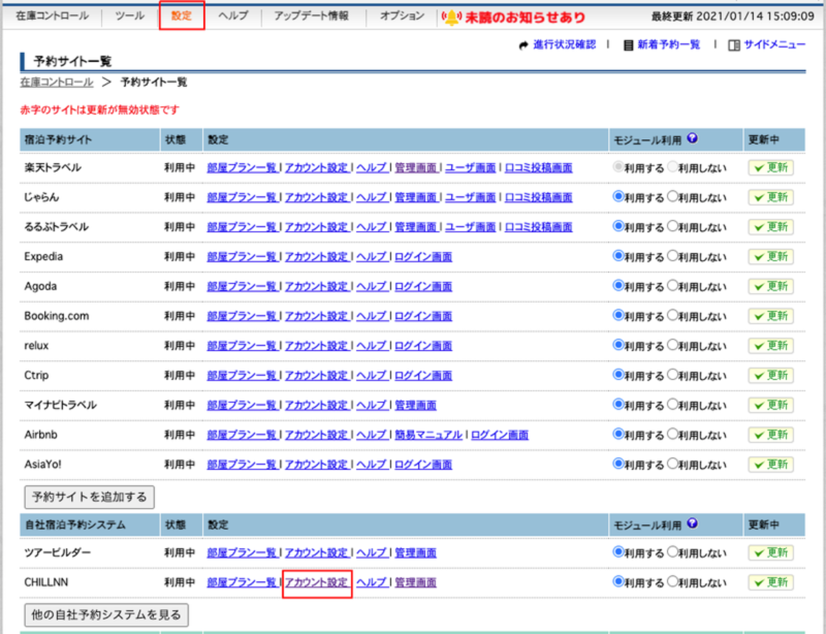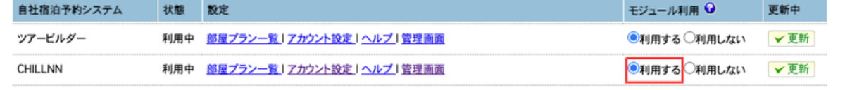 - 5.「予約サイト一覧」でCHILLNNのモジュール利用を「利用する」にチェックを付けます。