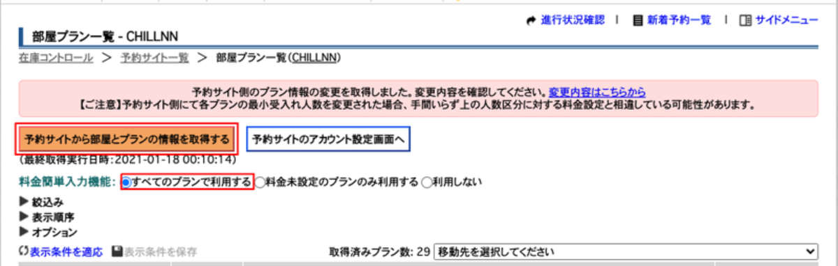 - 7.CHILLNNで設定した部屋とプランを反映させるために[料金簡単入力機能]の「すべてのプランで利用する」を選択し、「予約サイトから部屋とプランの情報を取得する」をクリックし、紐付けを行います。