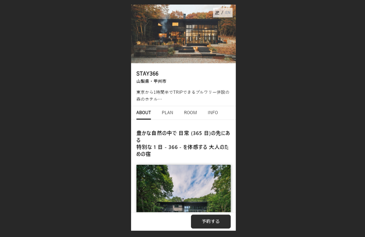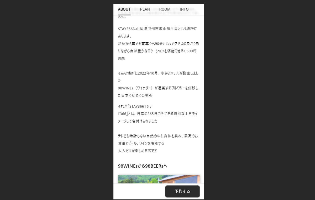 STAY366さんでは、「大人がゆっくりとお酒を楽しむ宿」という明確なコンセプトのもと、ターゲットを絞った集客を行っております。そのため、写真やテキストで雑誌のような予約ページを作成し、宿へのこだわりなど独自に持つ魅力をストーリー仕立てで表現することでお客様と施設側とのミスマッチを防ぎつつ、集客効果の最大化に尽力させて頂いております。その結果、オープンから約1年で、現在は3カ月先までほぼ予約で埋まっている人気のお宿となっております。
