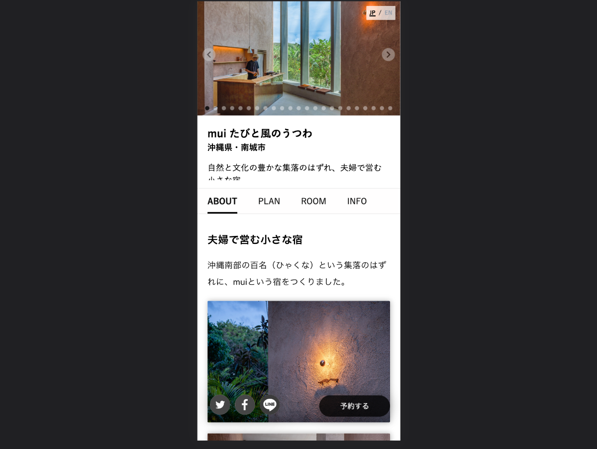 mui様はあえてホームページでは具体性を抑えて、ゲスト様それぞれの感性で世界観を感じていただけるようイラストをメインに表現をしております。予約ページで初めて写真やテキストを通した宿泊体験が具体的にイメージができるような導線設計を構築しています。