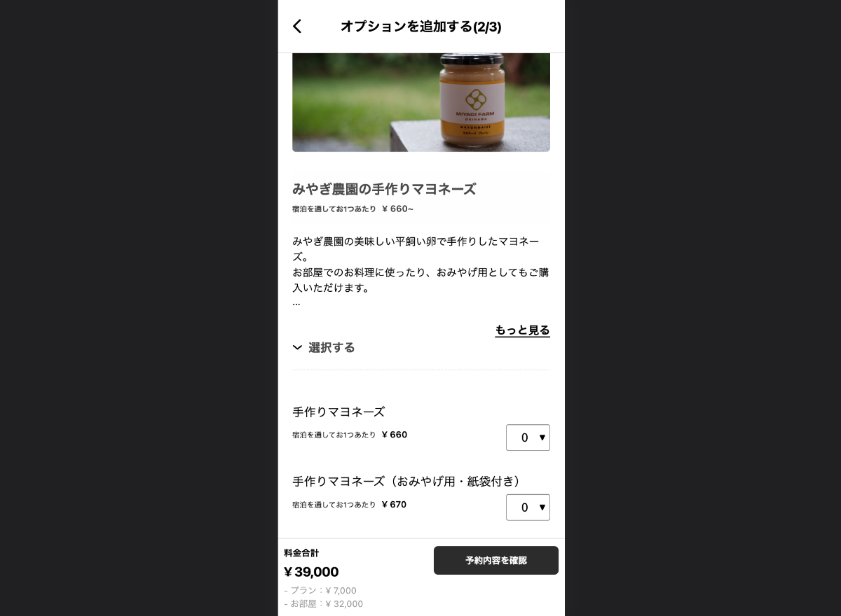 その他にもオーナーが仲良くされている農園「自家製マヨネーズ」をお土産品として追加することができます。お土産屋さんでは手に入らないようなこだわりのお土産を宿の予約と一緒に手に入るという新しい宿泊体験を構築していただいております。