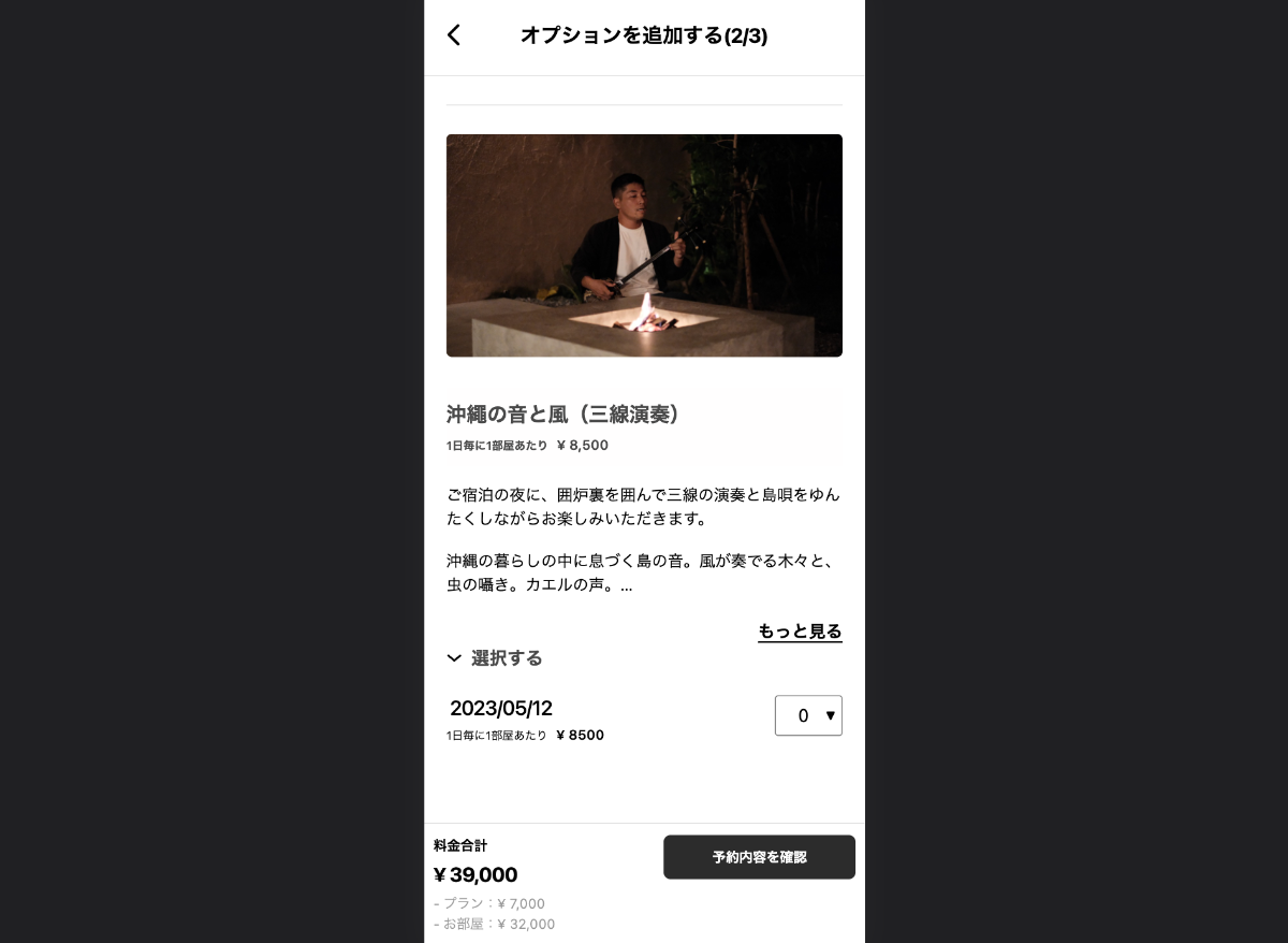 mui様では多くの体験をオプションで追加できるようになっており、ゲスト様が独自の宿泊体験をカスタマイズすることができます。