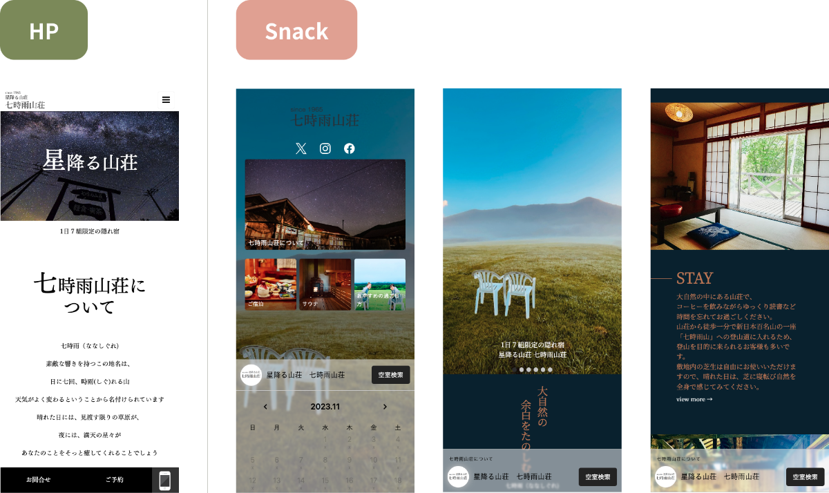 ▼ HPとSnack予約ページのイメージ(七時雨山荘様)