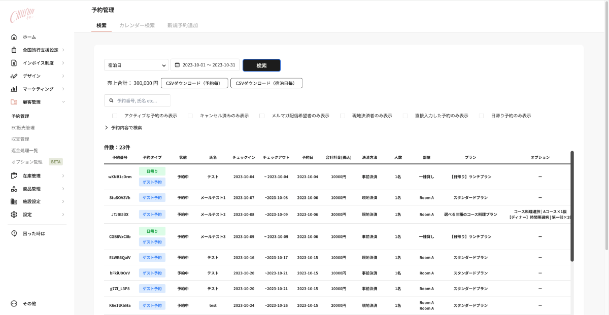 CHILLNN管理画面では、予約情報や決済情報などの顧客情報を一括で管理することができます。