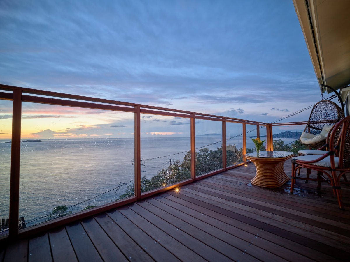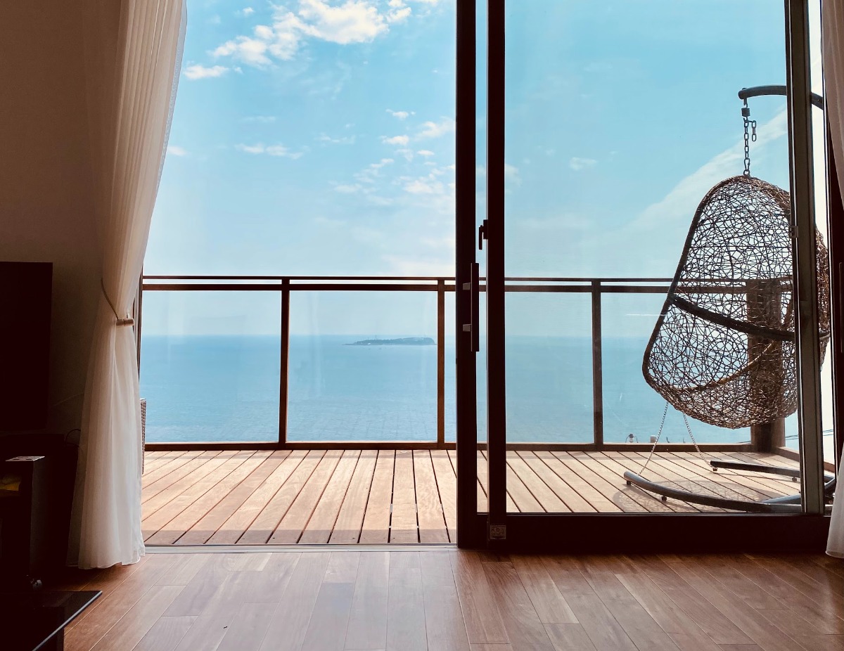 網代山の中腹にあり、180°パノラマの海眺望と、1年を通じて日の出を拝むことができるプライベートハウスです。