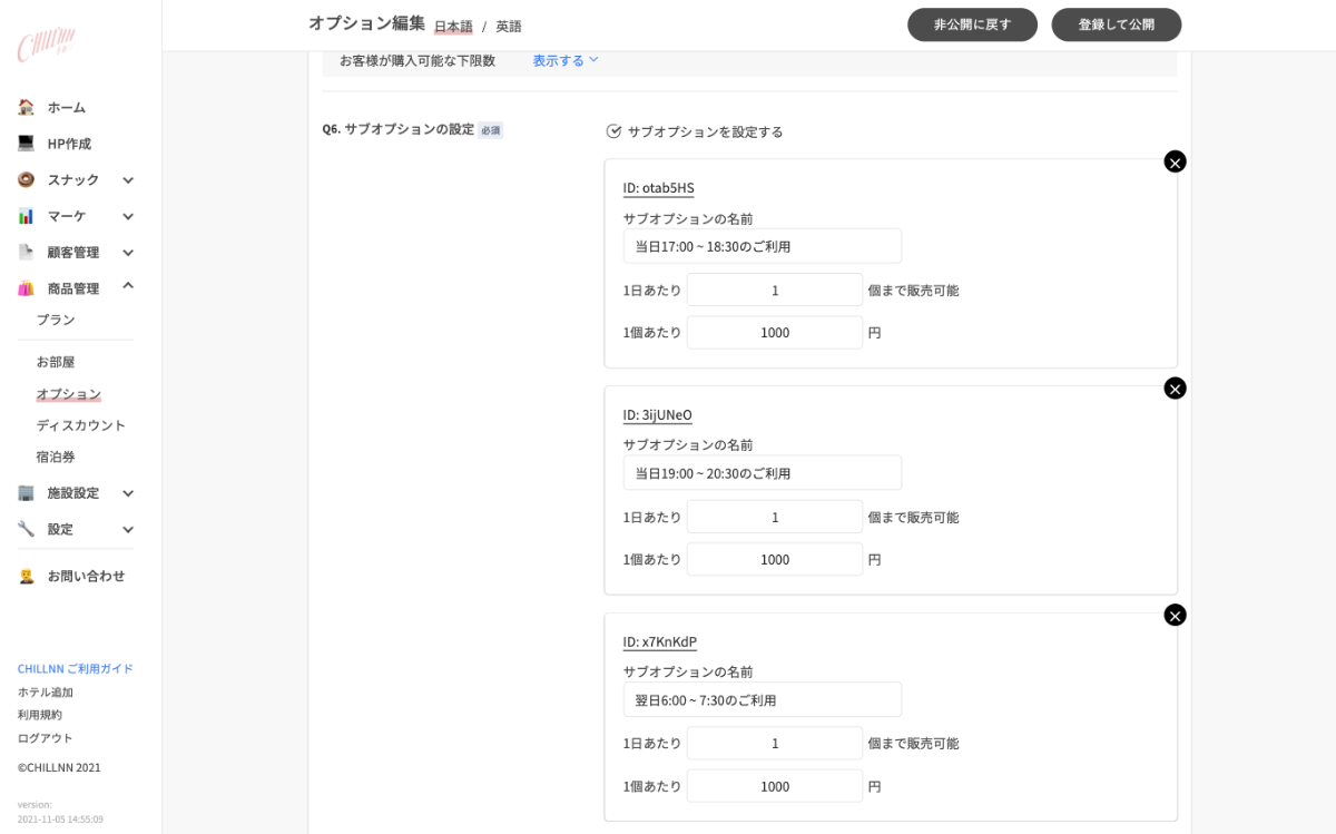 サブオプションの名前は、時間貸しの場合は時間を、料理などのコースの場合は料理名をご設定ください。