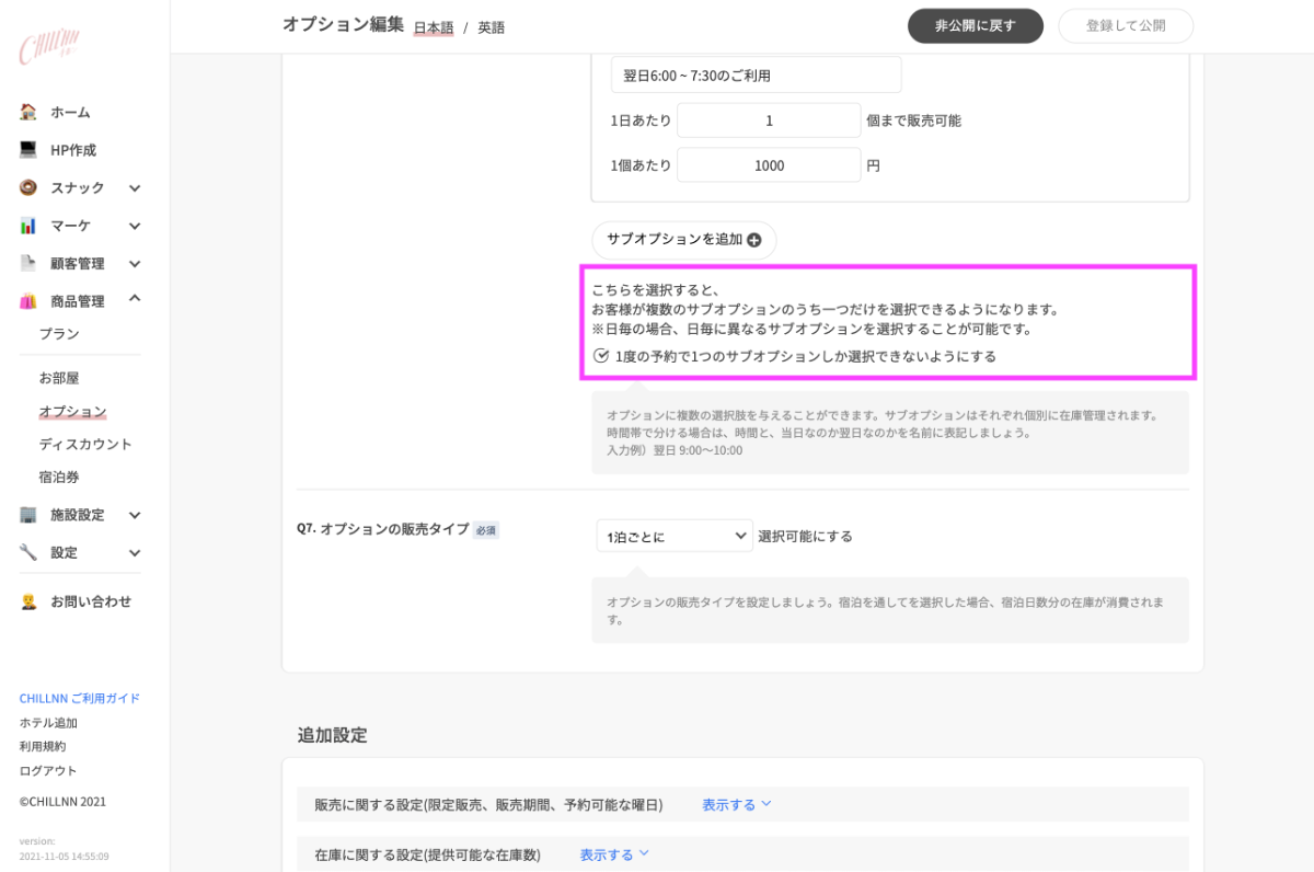 さらに、ご予約あたり、サブオプションを1度しか選択できないようにしたい場合は。以下の項目にチェックを入れてください。