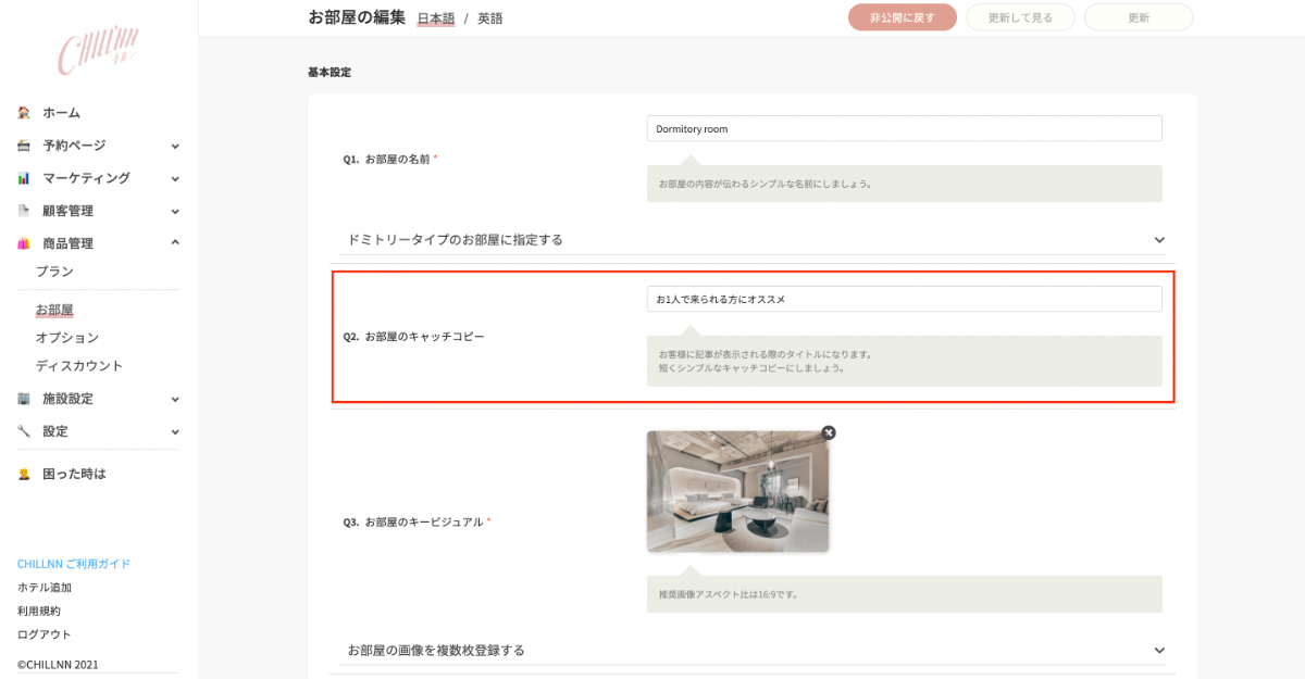 プラン編集画面の「Q2.お部屋のキャッチコピー」から任意で編集が可能です。