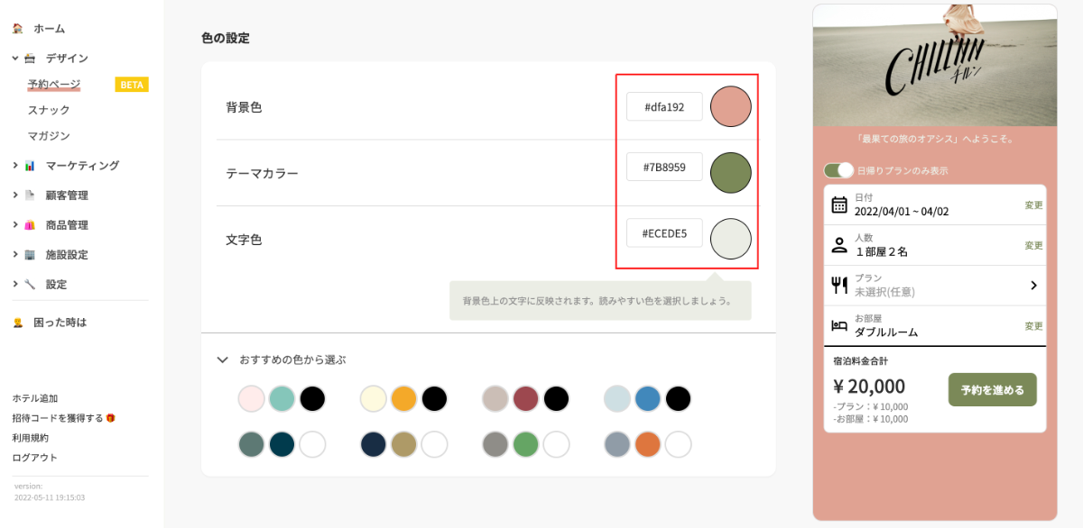 ゲストの予約しやすさと、色などのカスタマイズ性を両立した、とっても使いやすい予約ページとなっておりますので、ぜひ一度お試しくださいませ。