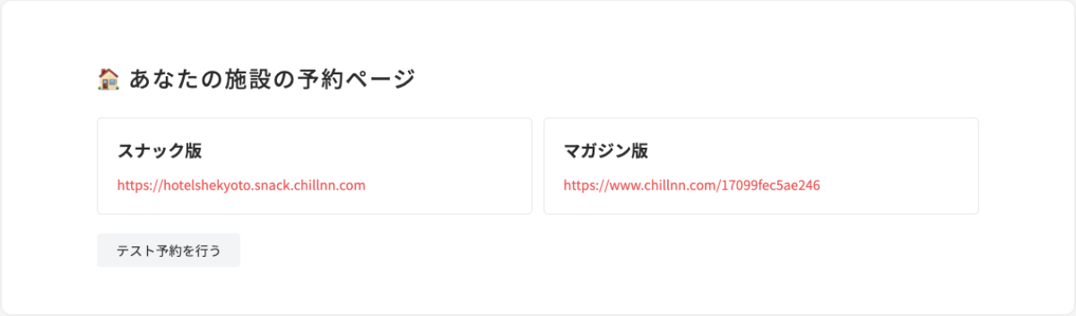 CHILLNNの各施設のホーム画面に「あなたの施設の予約ページ」というセクションがあります。