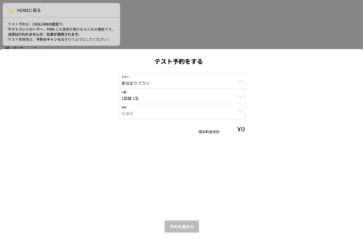 これまで、サイトコントローラーやPMSといった外部システムとの連携の確認や、CHILLNNでの販売価格を確認するためには、販売画面に移動して実際に決済情報を入力して確認する必要がありました。今回のアップデートによって、管理画面から何度でも簡単に決済情報を入力することなくテスト予約を行うことができるようになりました。