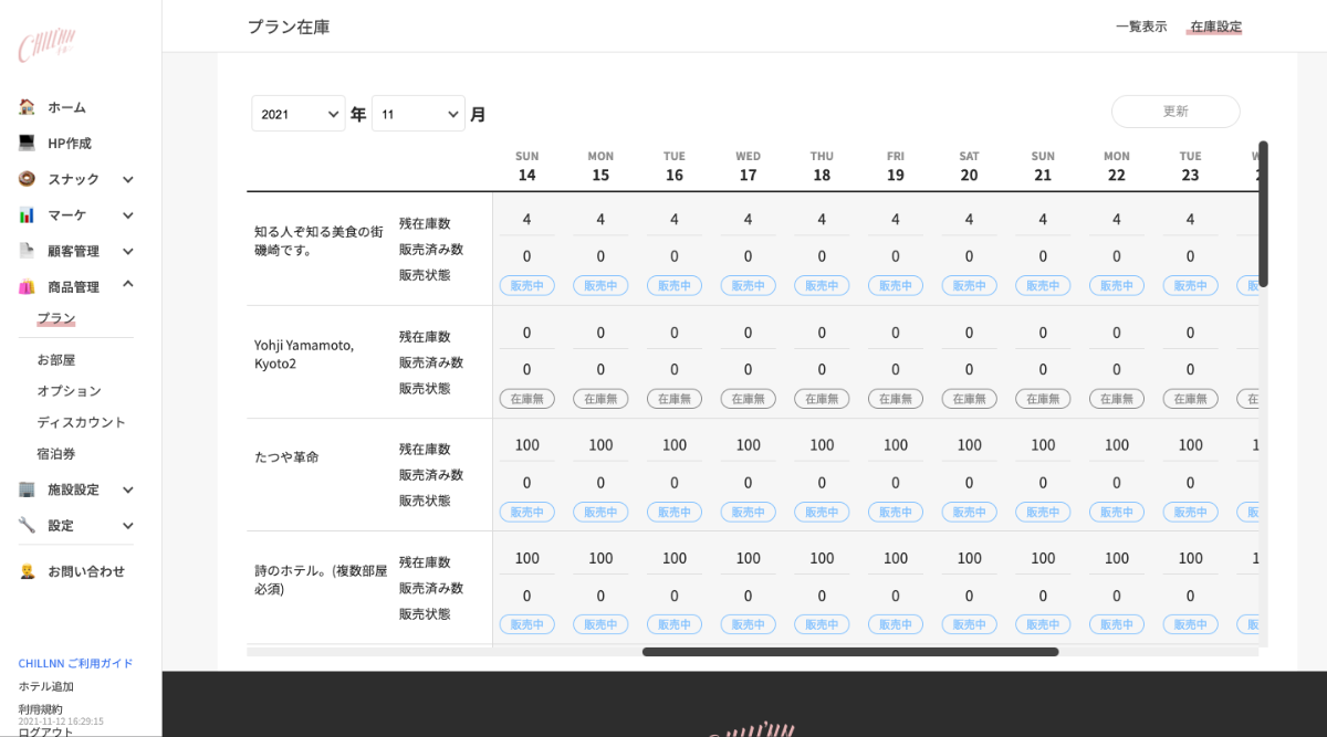 プラン、お部屋、オプションの在庫管理のページを開くと以下のような画面で在庫の管理ができます。