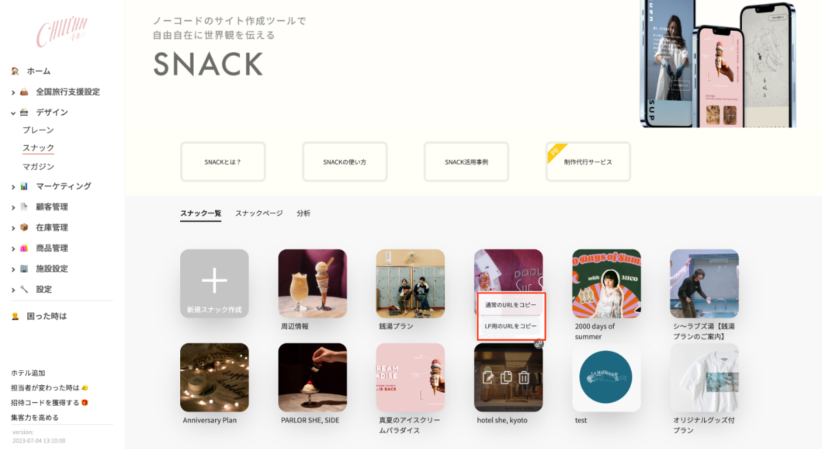 Snackの保存または新規でページ作成をしていただくと、以下の画面が現れます。