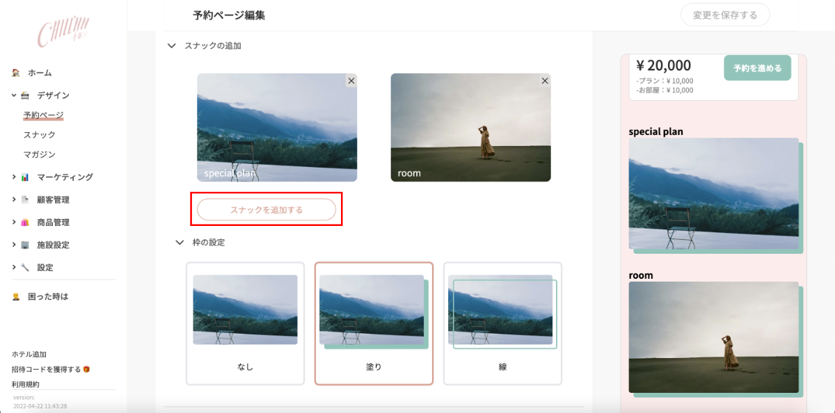 ※「デザイン > スナック > スナック一覧」より、スナックを事前に作成しておくことも可能です。