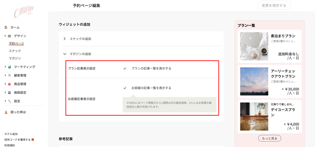 「プランの記事一覧を表示する」、「お部屋の記事一覧を表示する」にチェックを入れる