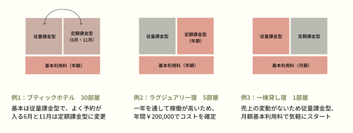 さらに、繁忙期の予約が入る期間のみ定額プランに切り替えるなど、時期によって使い分けていただいても構いません。