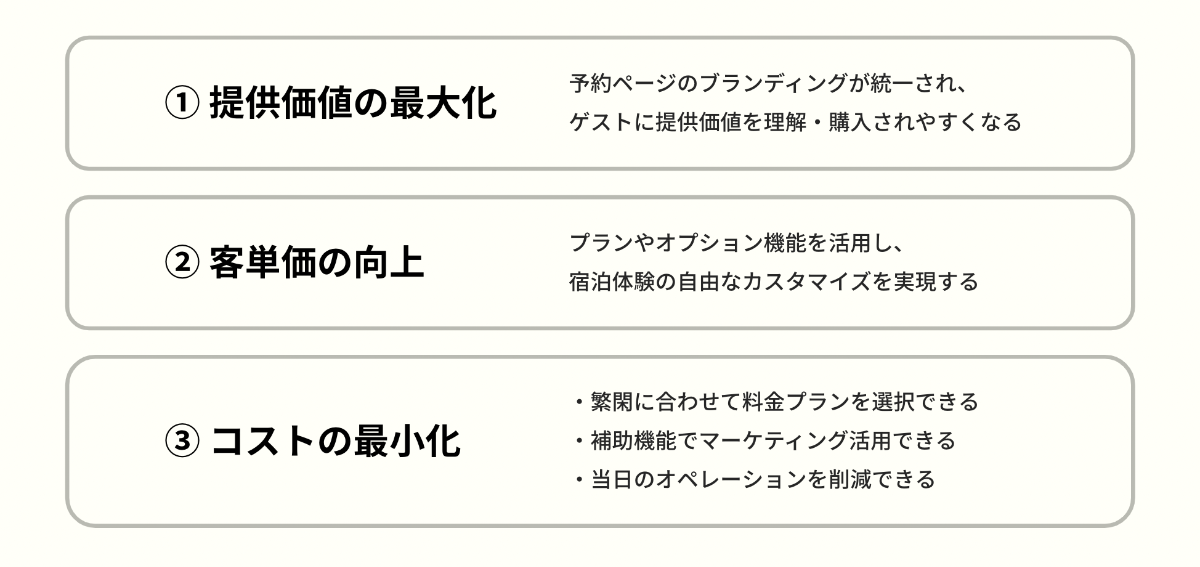 このように、プランやオプションを簡単に管理・活用することでサービスの幅が広がり、ゲストにより満足していただけます。その結果、客単価の向上が見込まれます。