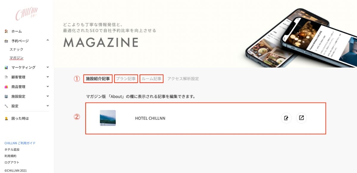 ① 管理画面から「予約ページ」「マガジン」を選択