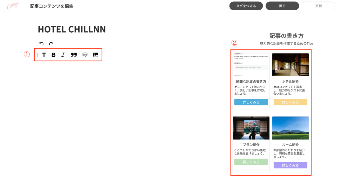 トップページにあたる施設紹介記事、作成したプランに紐づくプラン記事、作成したいお部屋に紐づくルーム記事❷ 記事の編集 / URL抽出