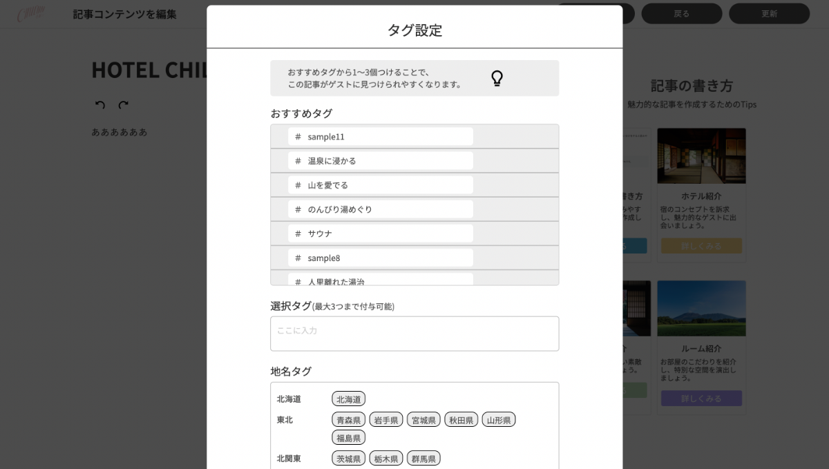 「更新」もしくは「タグをつける」を押すと、タグ設定という画面が表示されます。