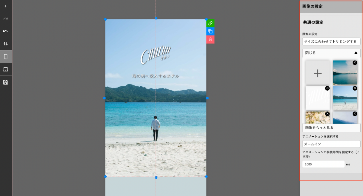 画像であれば、画像の表示設定(全体表示やスライドショーなど)やアニメーションなどの細かい設定が可能です。画像のサイズや位置などは直接画像を触りながら編集できます。