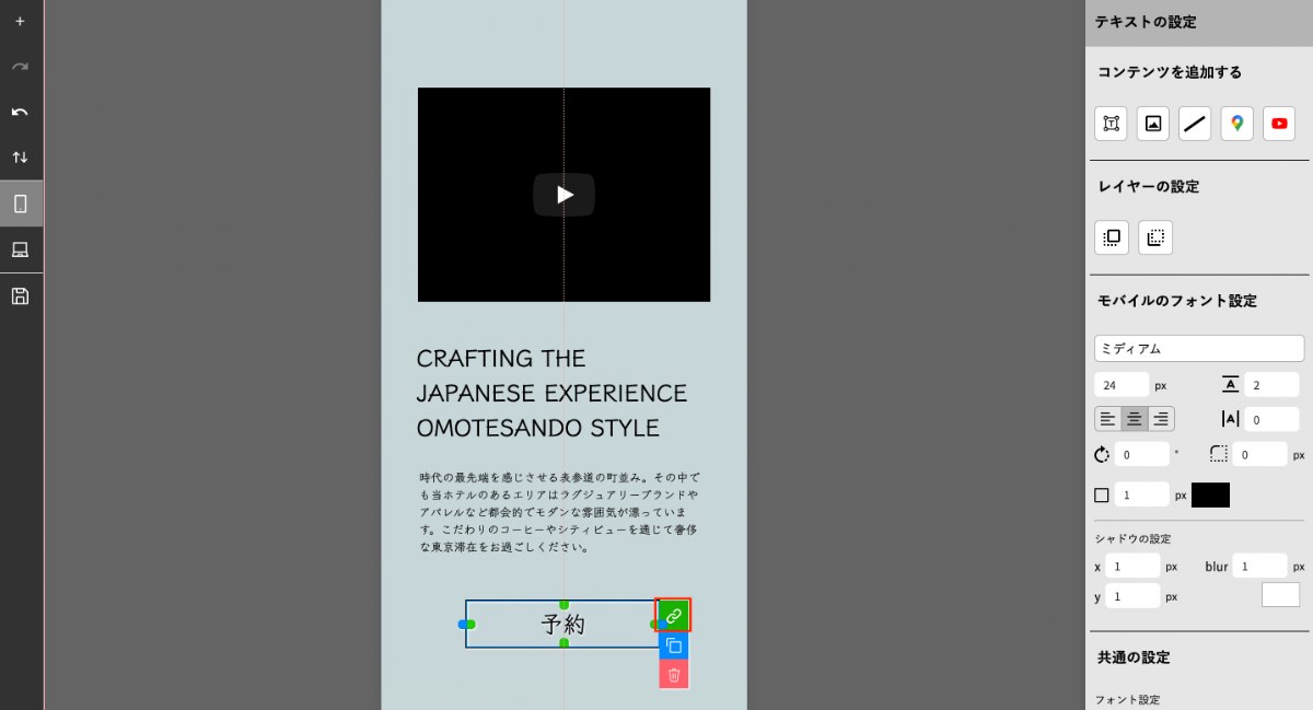 テキストを触ると、右側に緑色のクリップマークが表示されるので、こちらから予約ボタンの設定することができます。