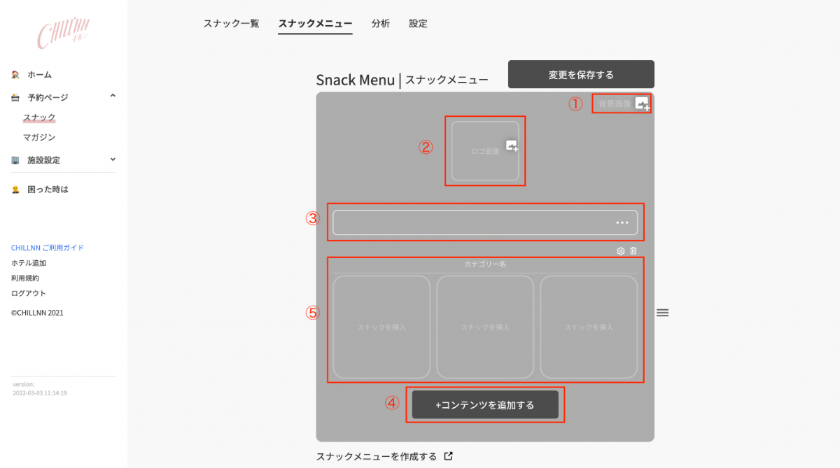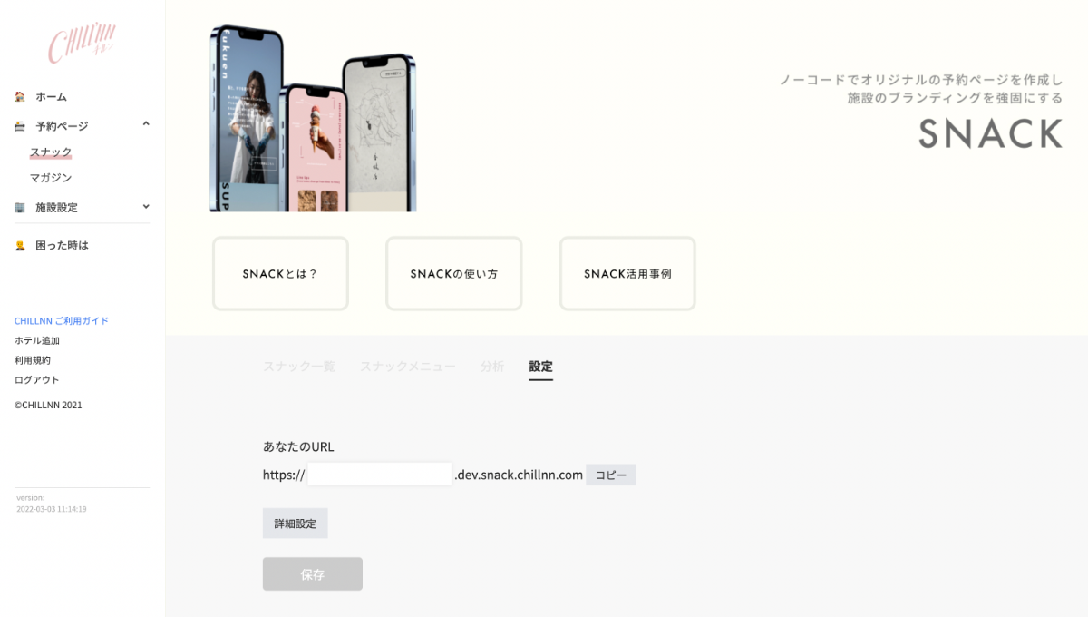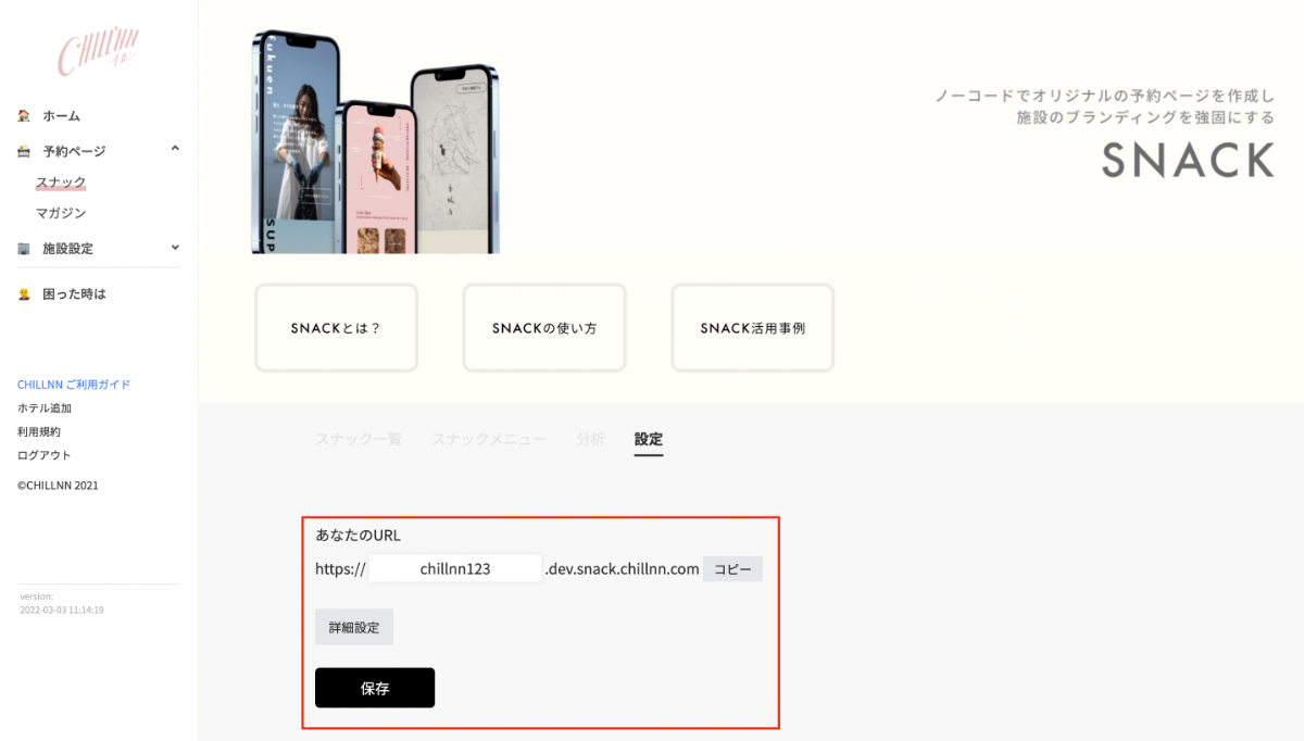 こちらで設定するページ(スナックメニュー)は②で設定したURLのトップページになり、お客様が予約ページに来た際に一番最初に触れる画面になります。