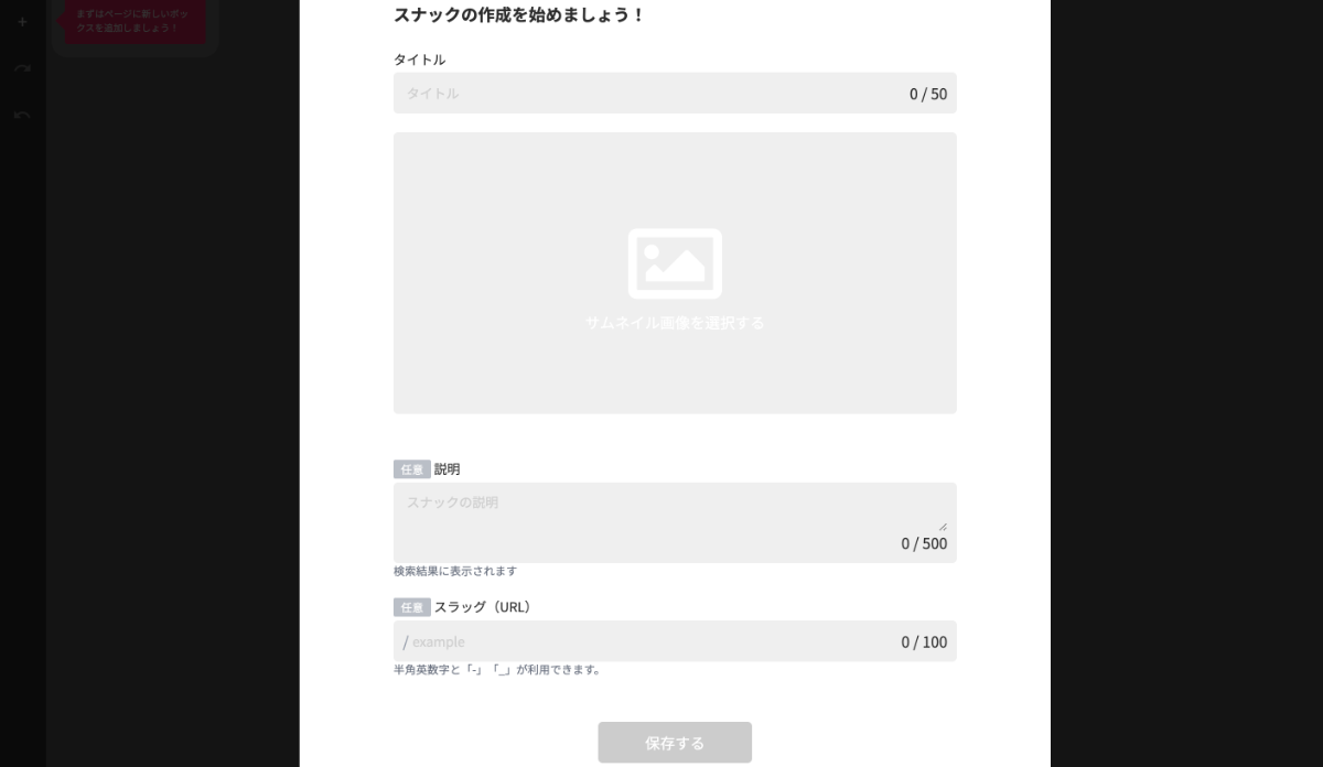 空白のページをクリックすると、「サンプルスナック」というページを入れ込めるので、先にサムネとタイトルを変えておくと、後から中身を作成していく際に便利です。