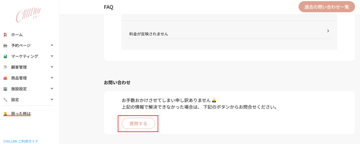 - 現地決済限定のプランを作成していただいた状態で下記画像の管理画面の問い合わせ画面より、現地決済のみに設定するプラン名を連絡してください。CHILLNN側で現地決済のみの設定をさせていただきます。