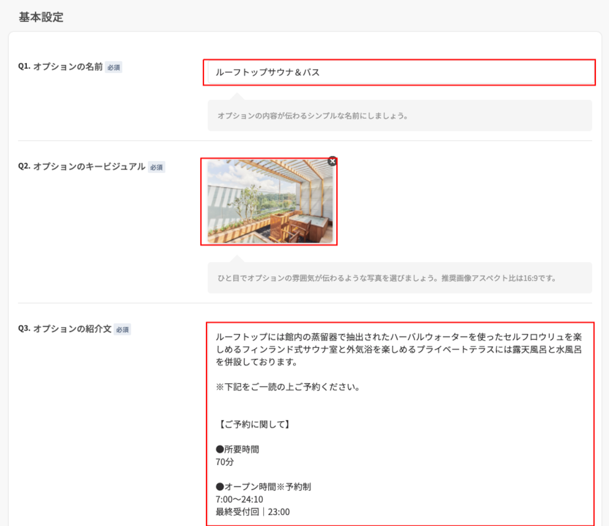 オプション販売の中で、サウナや、会議室、貸切風呂の利用など、ホテルの施設を宿泊予約に紐付けて時間帯などで区切って販売できる機能をリリースしました。