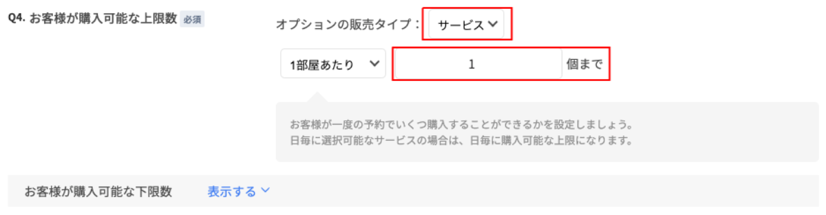 3.オプション販売の種類を[グッズ]と[サービス]を選択し、[Q4.お客様が購入可能な上限数]を設定します。
