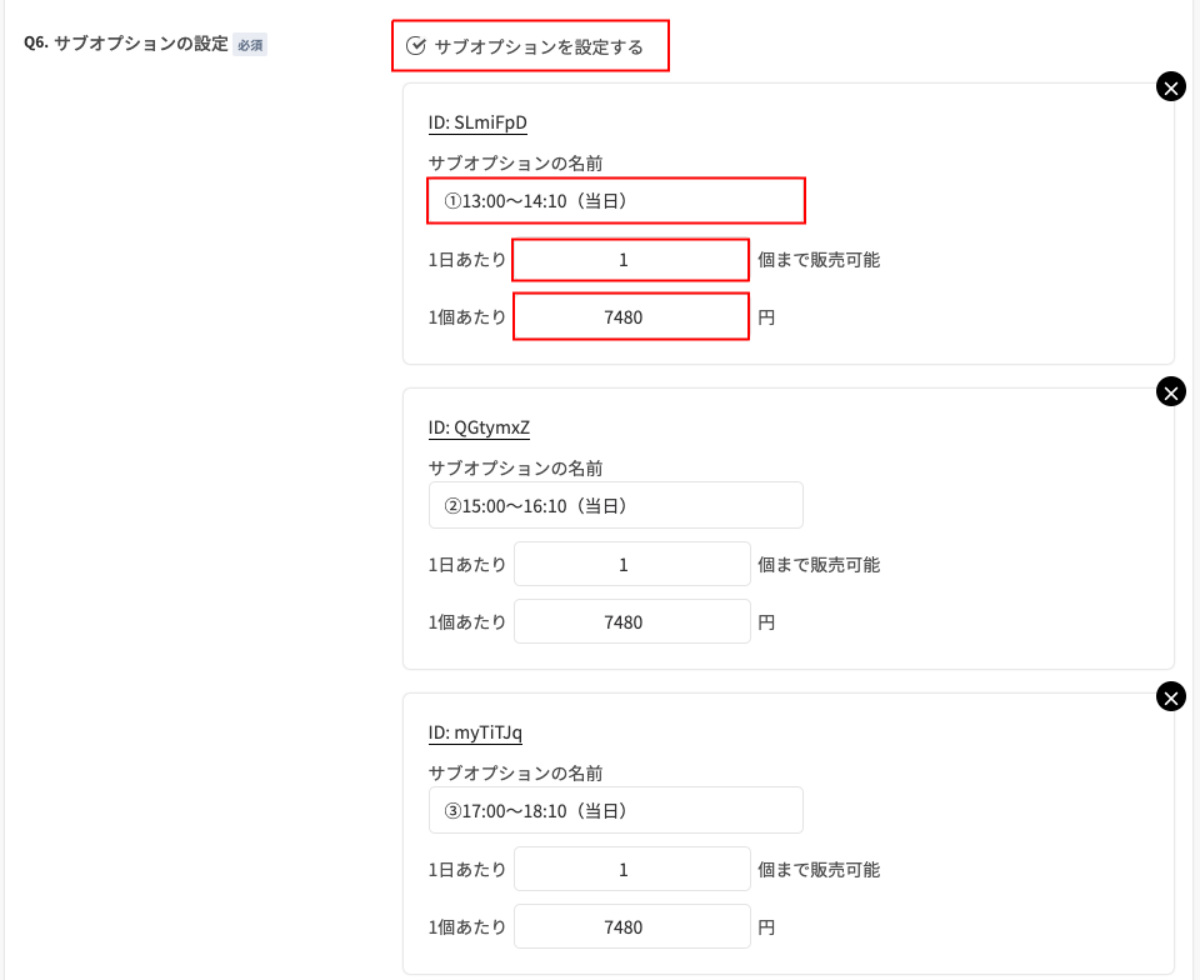 4.[Q6.サブオプションの設定]でサブオプションを設定するを選択し、[サブオプションを追加]からサブオプションを追加していきます。ひとつひとつのサブオプションに[サブオプション]の名前、[1日あたりの販売上限数]、[1つあたりの価格]を設定しましょう。