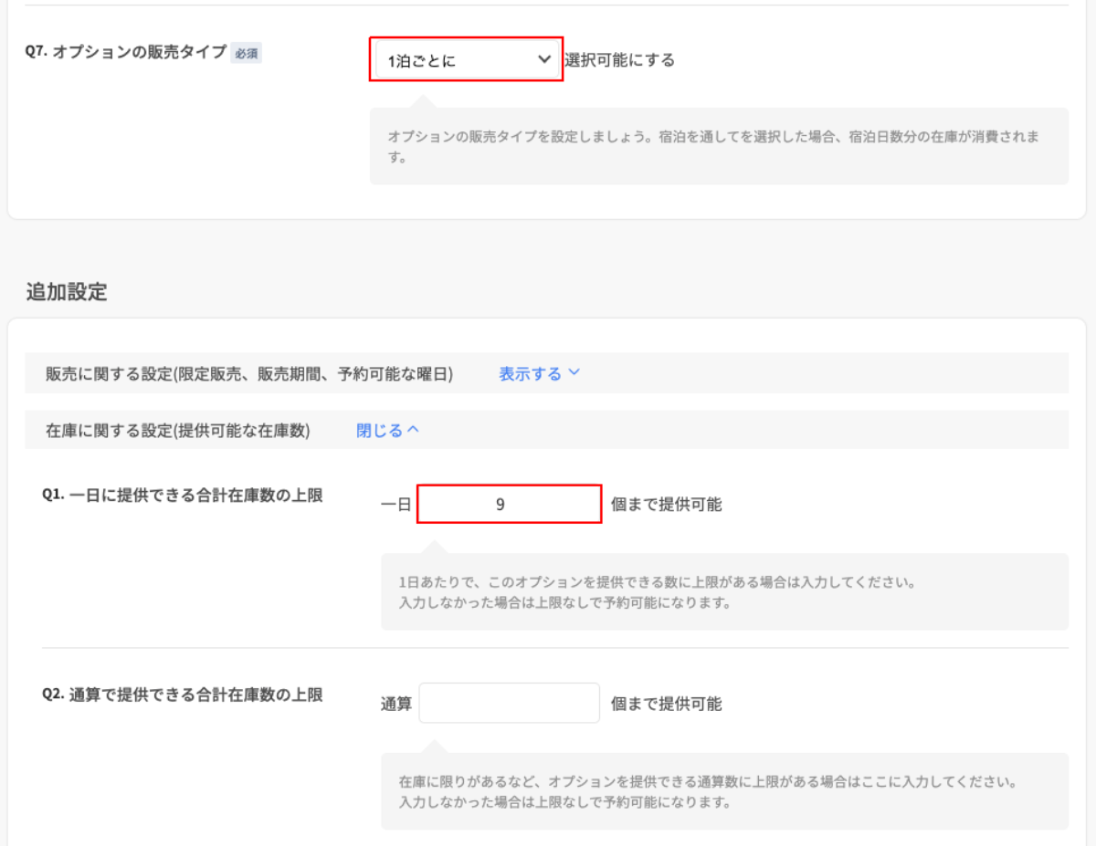 5.[Q7.オプションの販売タイプ]を一泊ごとに選択可能か、宿泊を通して選択可能かを設定します。また、追加設定で必要があれば、1日の提供できる合計の在庫上限や通算在庫の上限も設定することができます。