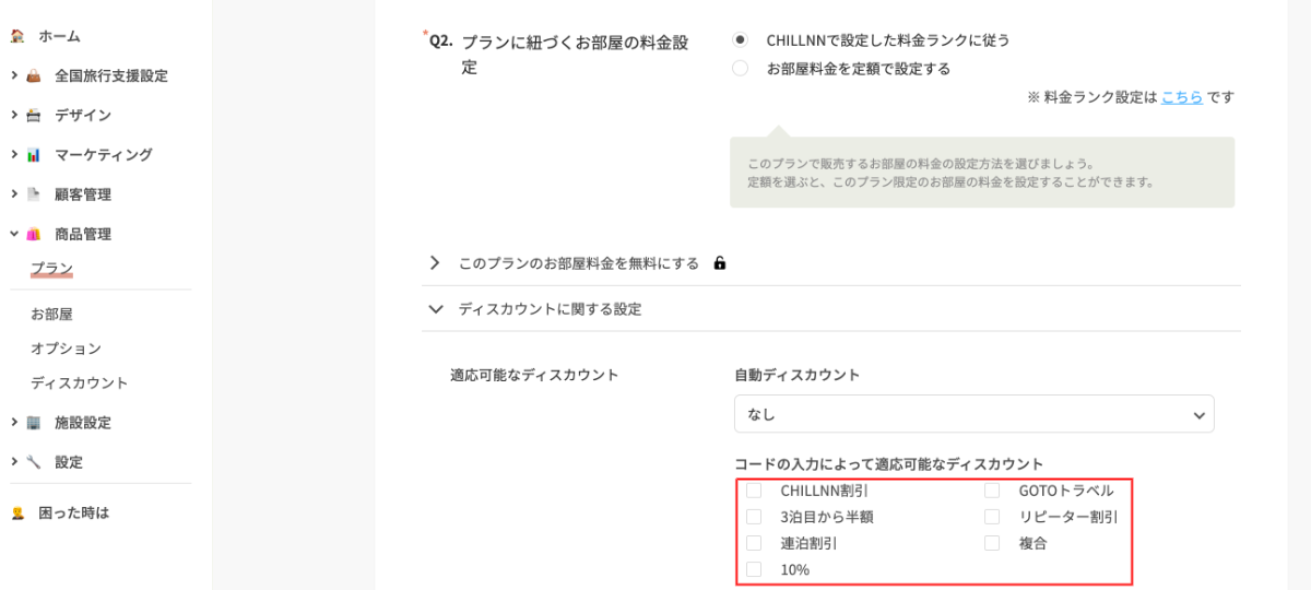 CHILLNNではディスカウントのプランの作り方が下記2通りあります。