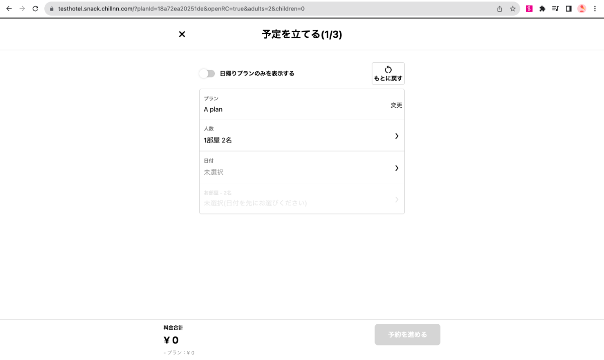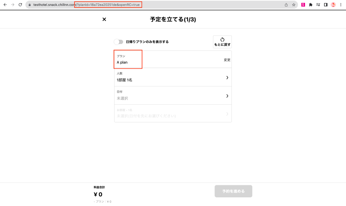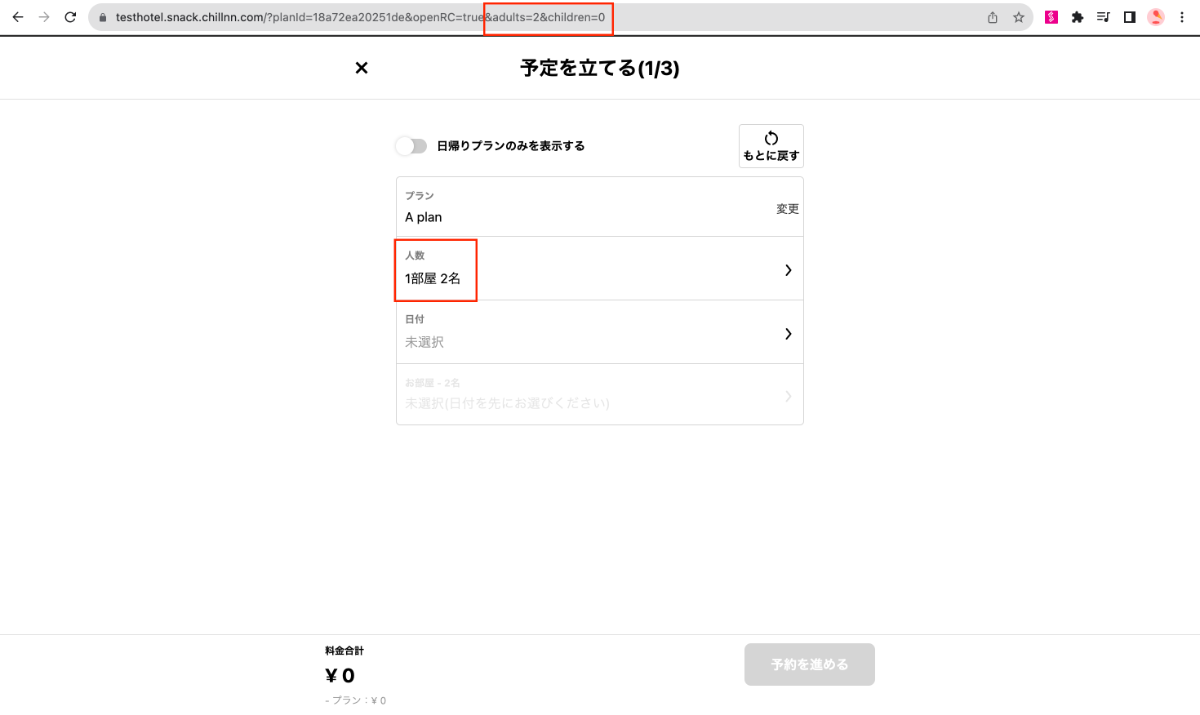 例)https://testhotel.snack.chillnn.com/?planId=18a72ea20251de&openRC=true&adults=2&children=0