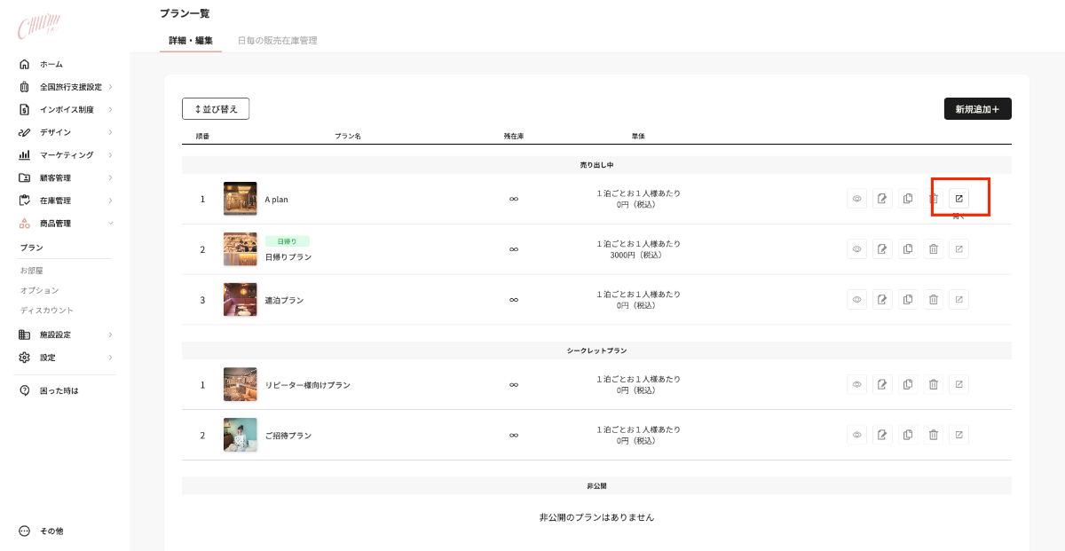 【商品管理】→【プラン】より、対象のプランを別ページで開きます。