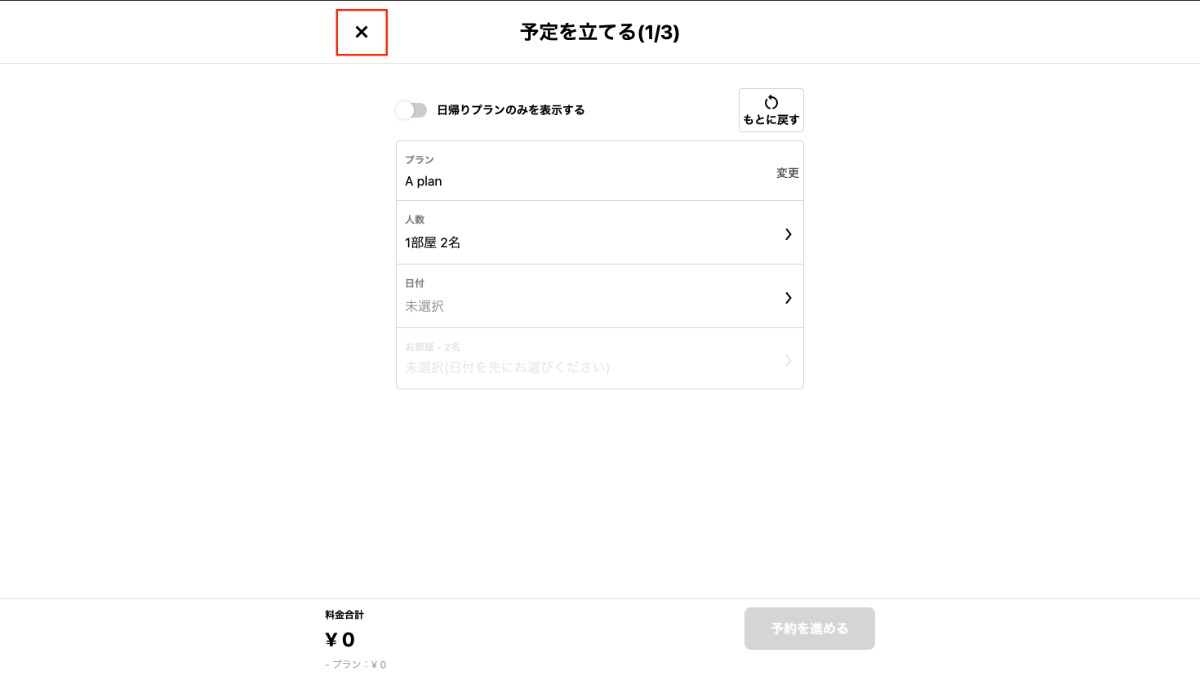 この記事では、プランや人数が設定されている状態の予約画面の表示方法を説明いたします!