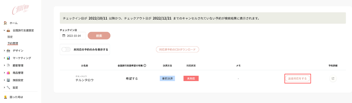 2.チェックイン日を選択していただき、該当の予約に関して「返金対応をする」からそれぞれ指示に従って処理を行なってください。
