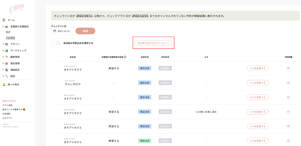 管理画面 > 全国旅行支援設定 > 予約管理 > 対応済予約のCSVダウンロード