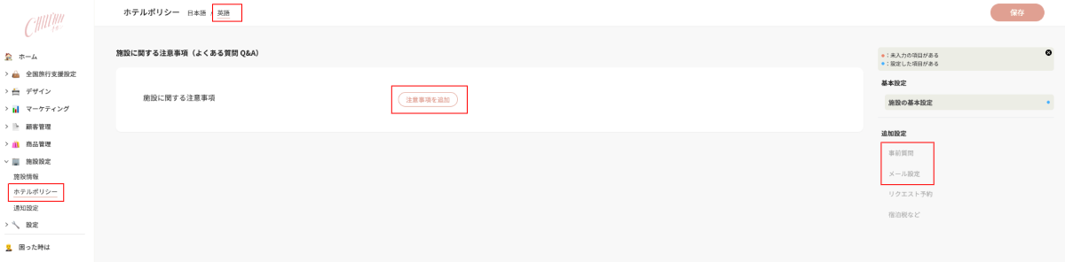 施設設定 > ホテルポリシー > 英語 より設定いただけます。こちらを設定しないと日本語で設定したものが表示されますので、ご注意ください。また事前質問やメールの加筆も行っている場合は、こちらのページでご設定いただけます。