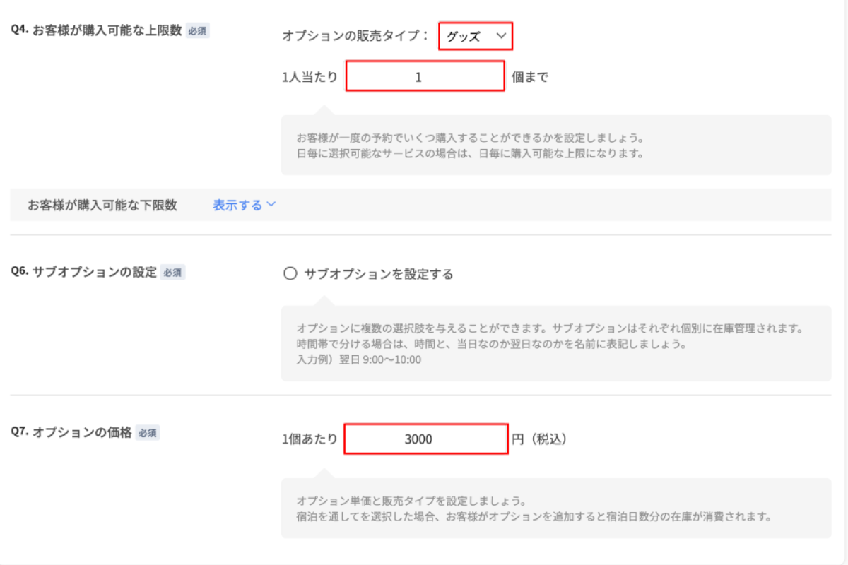 3.販売タイプをグッズかサービスか選択し、[お客様が購入可能な上限数]を設定します。(購入可能な下限数を設定することも可能です。)サブオプションはオプションの下のレイヤーで複数の選択肢を加えるものです。別途記事で説明します。次に[オプションの価格]を設定します。
