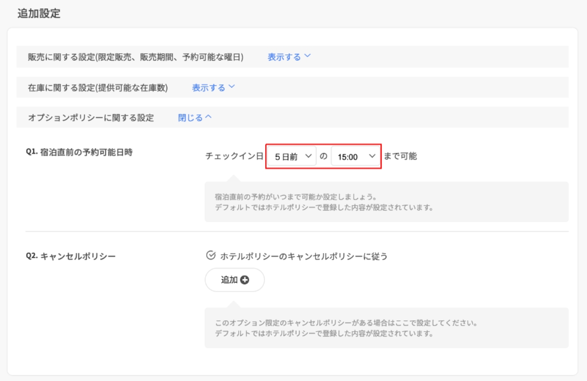 4.オプションの販売条件や在庫も追加設定から設定ができます。例えば、5日前までに予約が必要なオプションなら[宿泊直前の予約可能日時]で5日前と設定します。