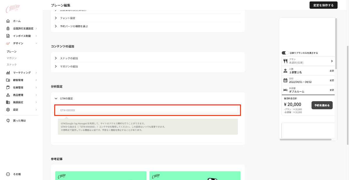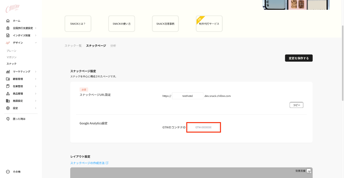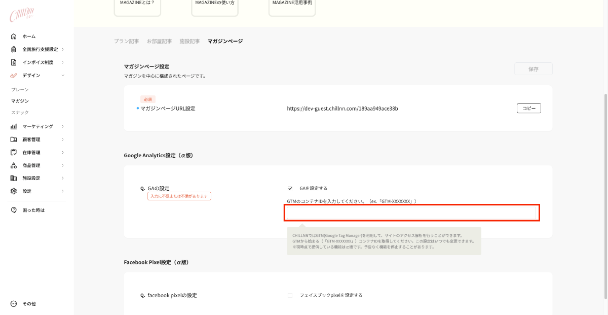 CHILLNN管理画面 [デザイン] ➡︎ [マガジン] ➡︎ [マガジンページ] ➡︎ [Google Analytics設定] から コンテナID※を入力