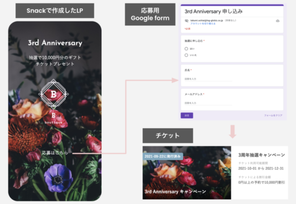 ギフトチケットを送付したいお客様のメールアドレスがわからなくても、例えば、SNSでプレゼントキャンペーンを展開し、GoogleFormなどでメールアドレスを記載して応募いただく形式を取ることで活用可能です。CHILLNNのSnack機能を使えば、キャンペーン用のLPを作ることも出来るので、ぜひご活用ください。