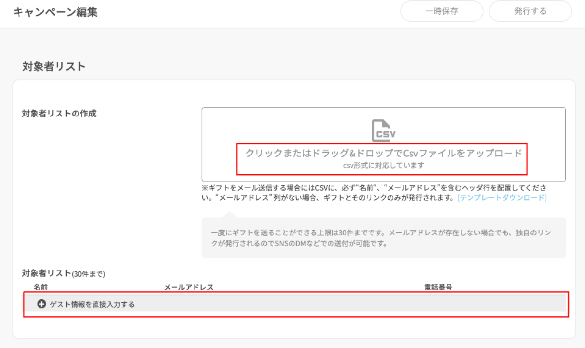 2.ギフトチケットを送付したい対象者のリストがあればCSVでアップロードします(※「名前」と「メールアドレス」のヘッダ行が必要です。テンプレートを参考にしてください)。リストがない場合はゲストの情報を直接入力してください。