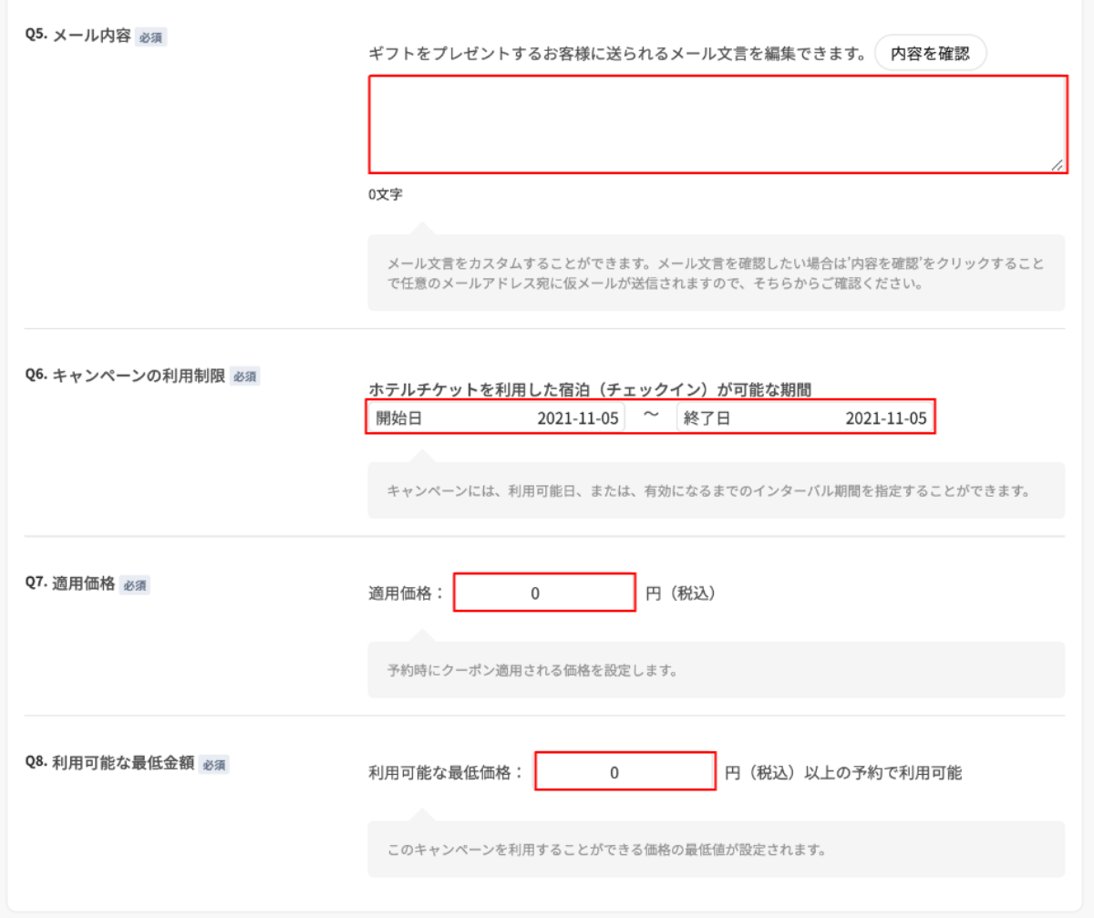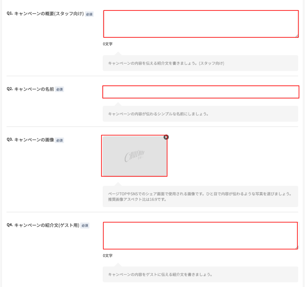 3.「キャンペーンの概要(スタッフ向け)」、「キャンペーンの名前」、「キャンペーンのメインビジュアル」、「キャンペーンの紹介文(ゲスト向け)」を設定します。